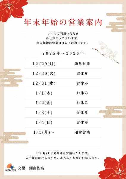 年末年始の営業についてお知らせ致します。